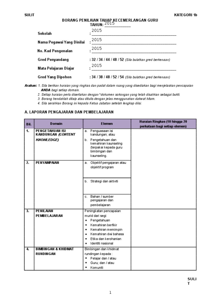 Borang Penilaian Tahap Kecemerlangan Guru Borang Kategori 1b Guru Pdf